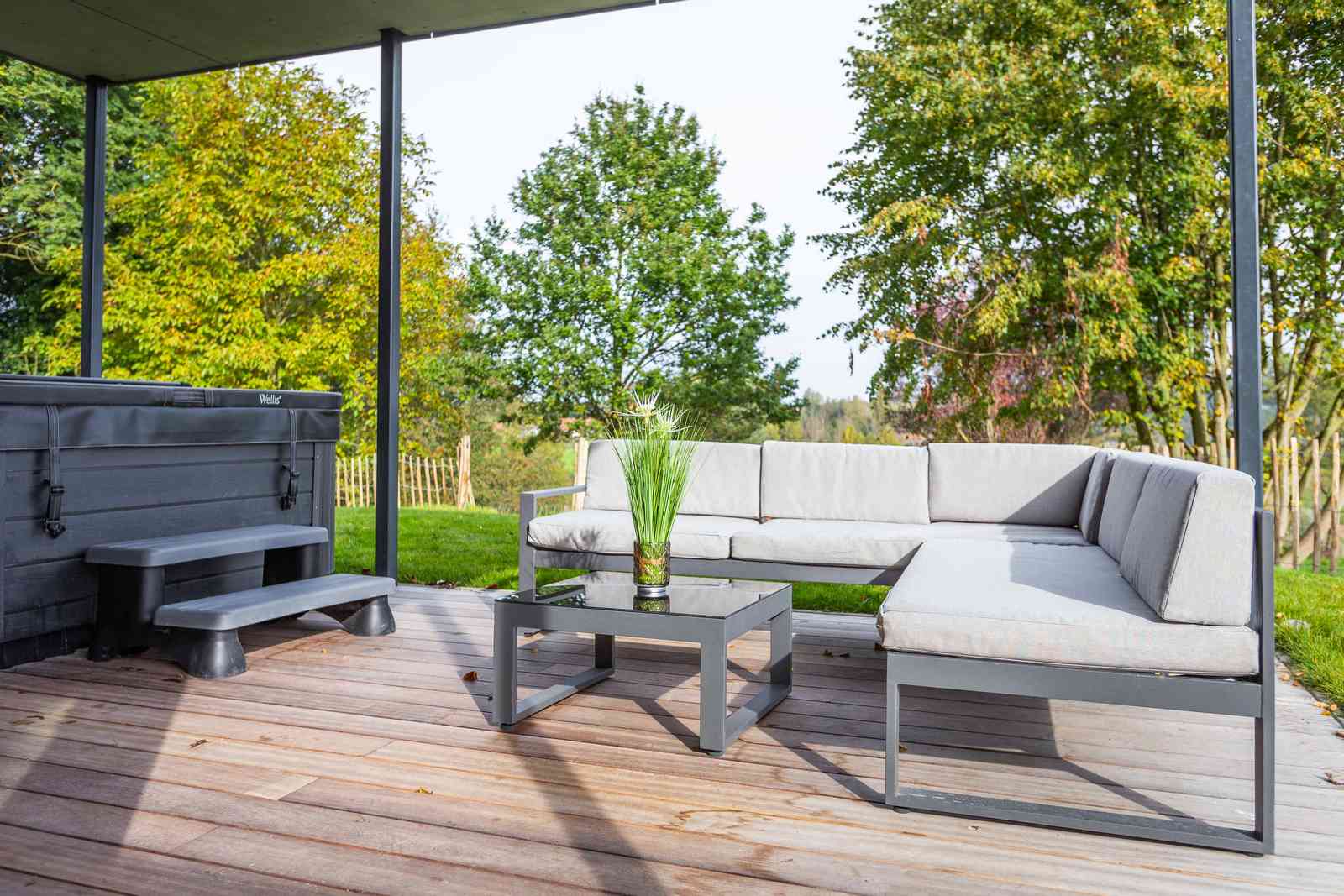 Les deux petits salons extérieurs offrent confort et détente à cet espace.